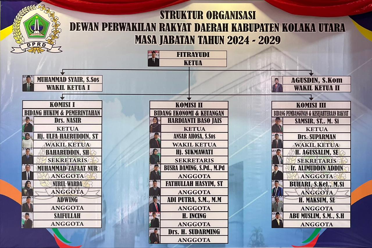 Struktur organisasi Dewan Perwakilan Rakyat Daerah (DPRD) Kabupaten Kolaka Utara periode 2024-2029 menunjukkan susunan kepemimpinan dan pembagian tugas yang terstruktur dalam menjalankan fungsi legislasi, pengawasan, dan penganggaran di tingkat daerah. Struktur organisasi ini dipimpin oleh seorang Ketua yang dijabat oleh Fitrayudi, yang dalam menjalankan tugasnya dibantu oleh dua orang Wakil Ketua. Wakil Ketua I dijabat oleh Muhammad Syair, S.Sos, sedangkan Wakil Ketua II dijabat oleh Agusdin, S.Kom. Ketiga pimpinan ini membentuk pimpinan kolektif yang mengkoordinasikan seluruh kegiatan DPRD Kabupaten Kolaka Utara.